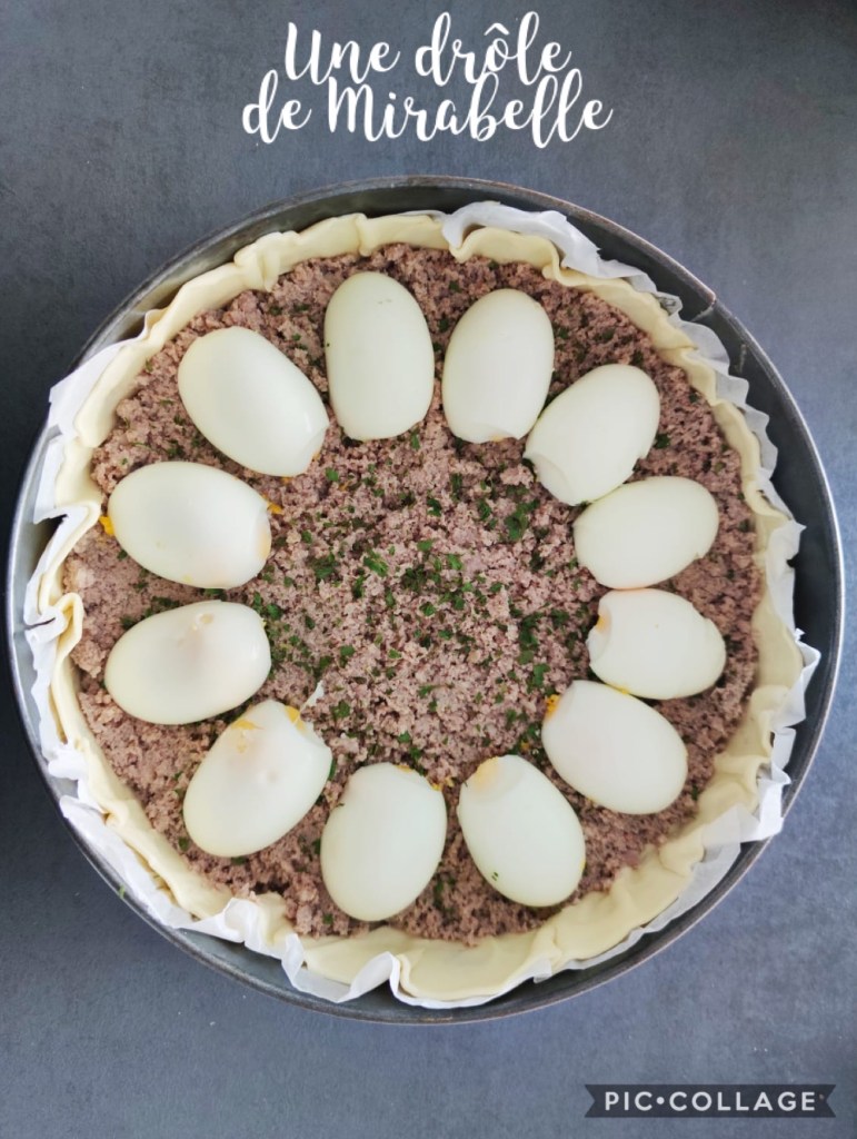 - Couper les œufs durs en 2 et les répartir tout autour de la pâte, comme sur la photo ci-dessous.