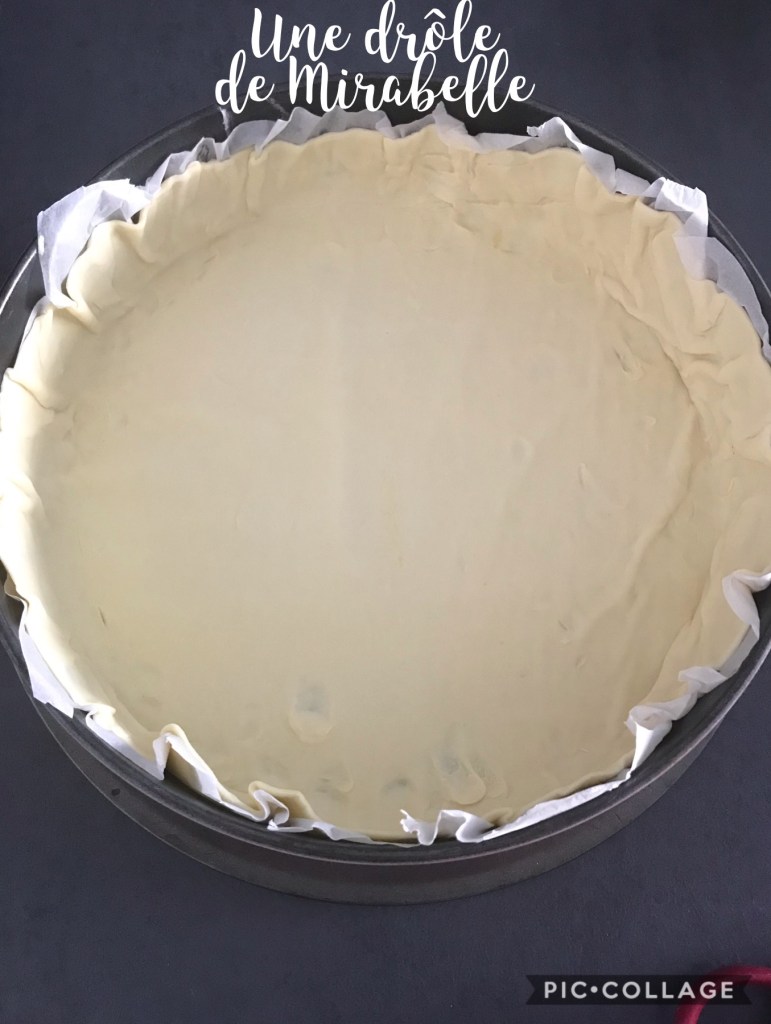 - Dans un plat à bords larges, étaler le premier rouleau de pâte feuilletée. La pâte doit bien recouvrir les bords, comme sur la photo ci-dessous.