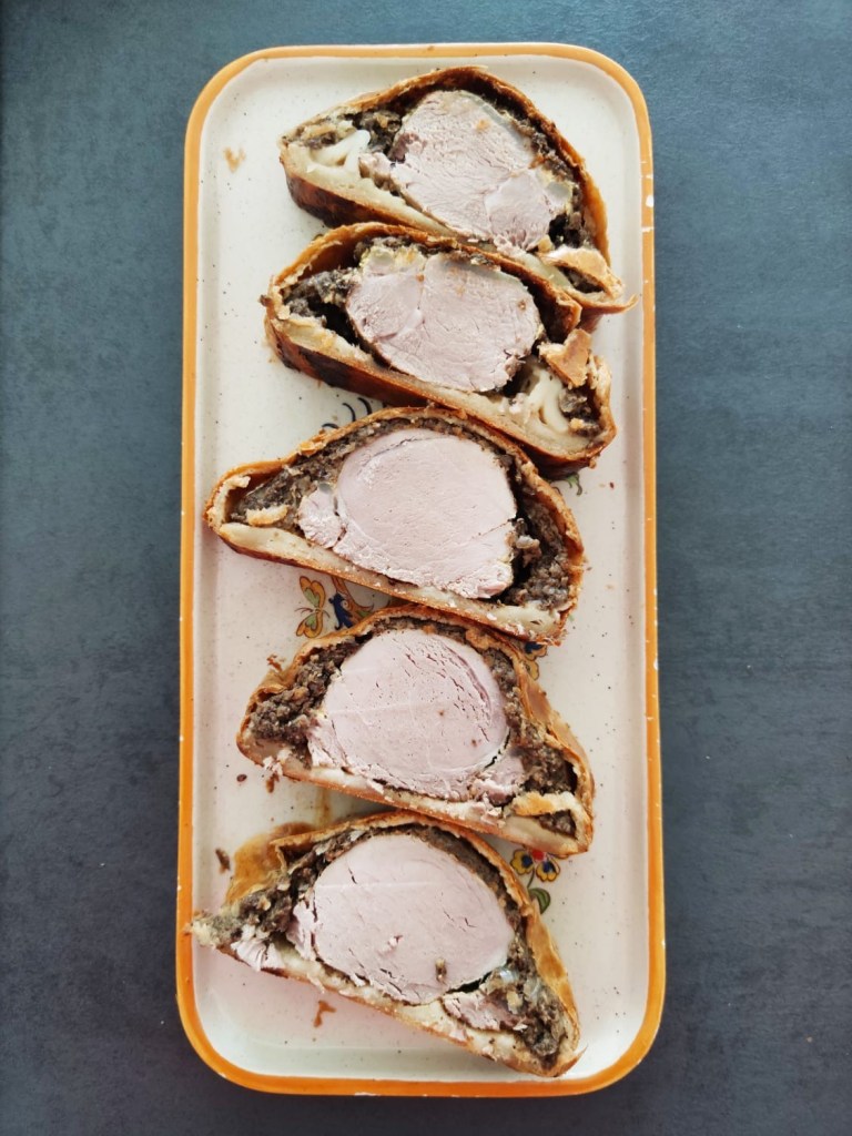 - Etaler une partie du mélange échalotes / champignons / persil au centre de la pâte, en forme de rectangle (10 cm de large X longueur de votre filet mignon). Déposer le filet mignon dessus. Répartir le reste du mélange échalotes / champignons / persil sur le filet.