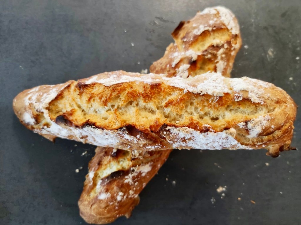 - Avec un ciseau, entailler chaque baguette en biseau (faire 4 ou 5 entailles) et les saupoudrer de farine.