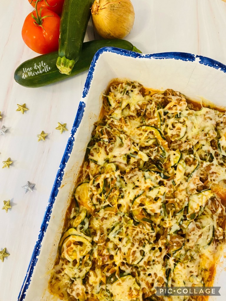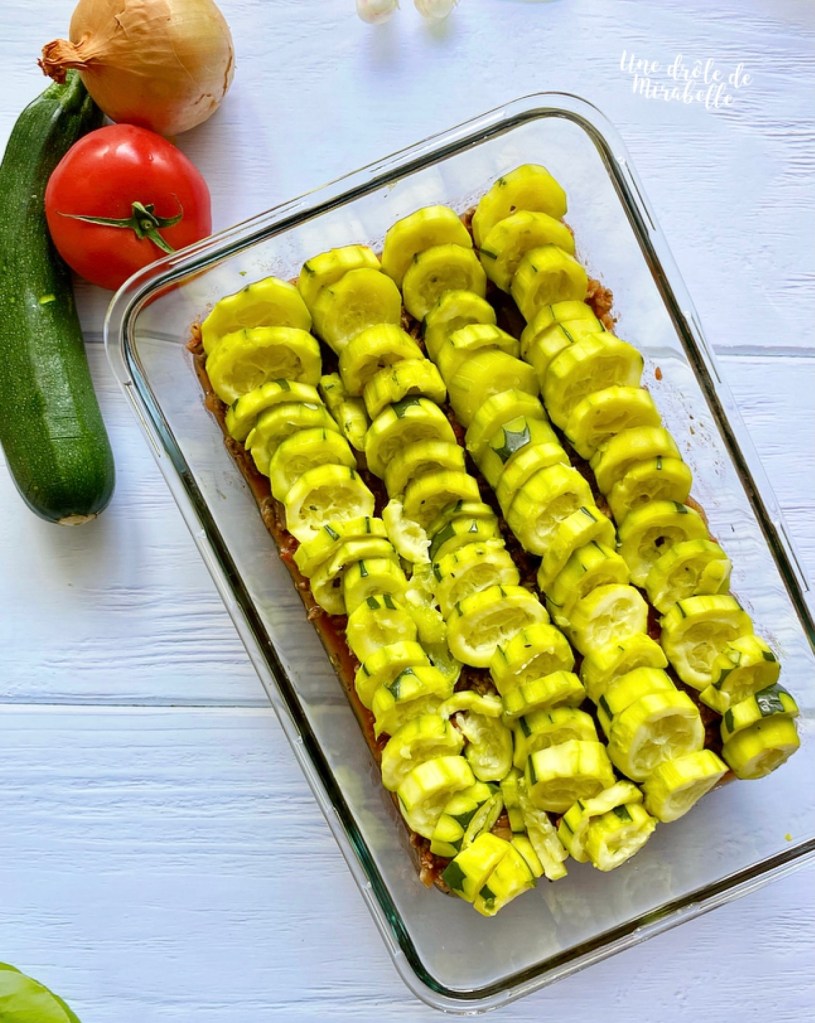 - Dans un plat allant au four, répartir la préparation à base de viande hachée. Recouvrir avec les rondelles de courgettes.