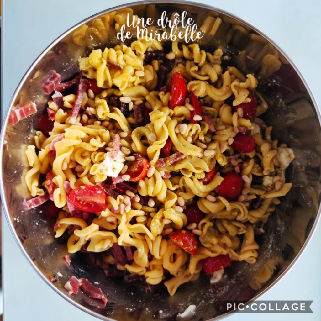 La salade de pâtes : l’incontournable des salades d’été ! On peut y mettre ce que l’on veut, et varier les plaisirs pour régaler à coup sûr toute la famille ! Comme il me restait un fond de sauce pesto au réfrigérateur, j’ai décidé de l’utiliser à la place de la classique vinaigrette… et on a tous adoré ! Alors, suivez le guide… mais n’hésitez pas à innover avec les ingrédients de votre choix !