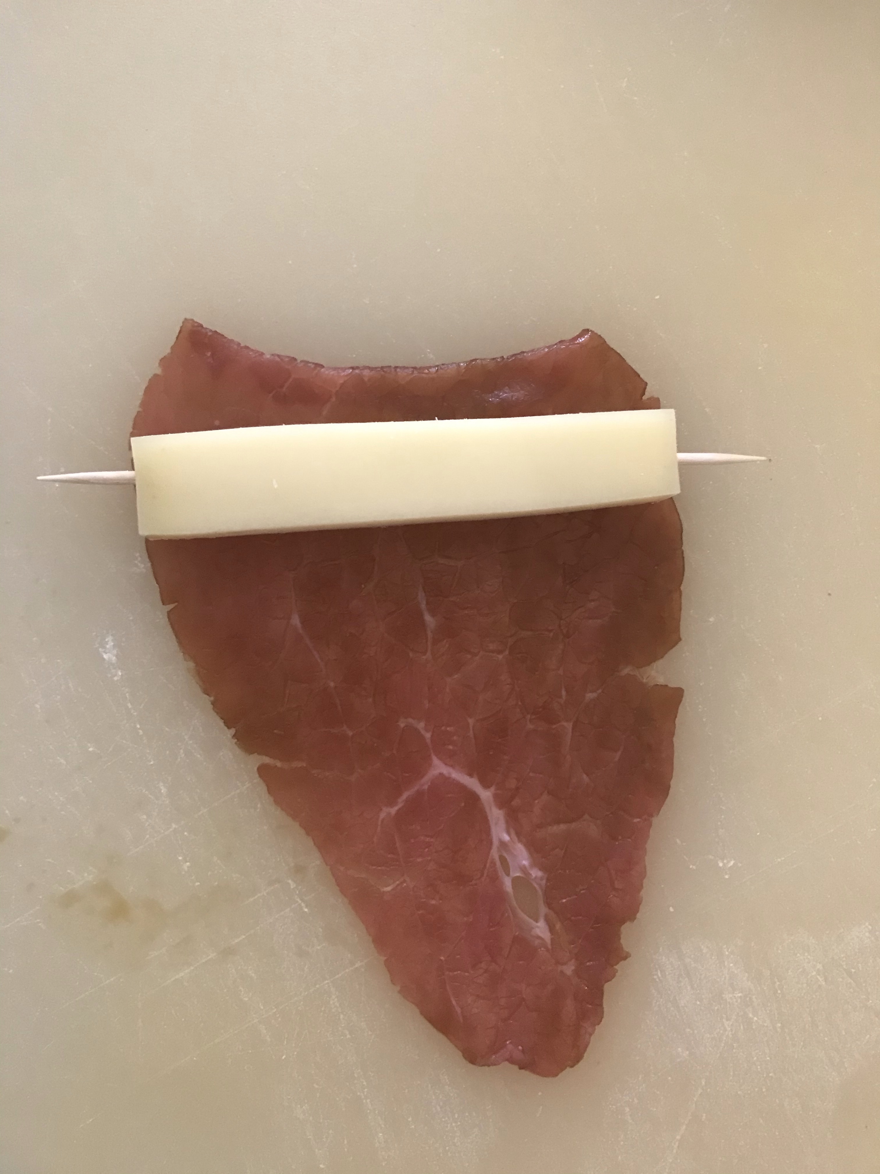 - Enrouler le morceau de comté dans une tranche de carpaccio mariné.