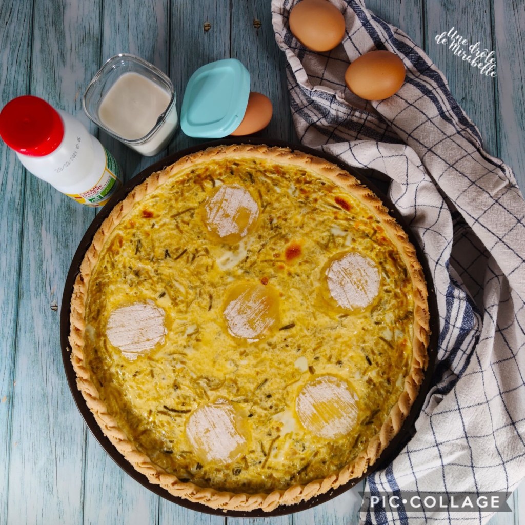 - Dérouler la pâte brisée et répartir les poireaux dessus. Répartir ensuite les morceaux de chèvre ou les cabecou et verser l’appareil à tarte.