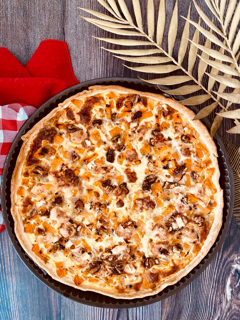 - Étaler la pâte brisée et répartir le mélange oignon / potimarron. Ajouter les morceaux de chèvre et les noisettes et verser l’appareil dessus.
