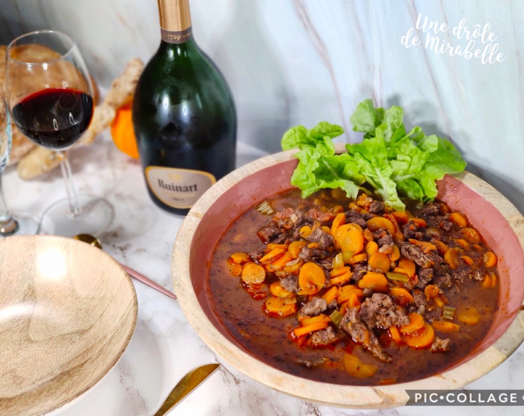 J’ai découvert cette recette dans le livre de Laurent Mariotte reçu à Noël ! Il me restait de la viande de bœuf au congélateur, et j’avais envie de changer du traditionnel bœuf bourguignon ou du goulasch : cette recette est donc tombée à pic ! Je vous la retranscrit telle qu’indiquée dans le livre, en indiquant toutefois mes menues adaptations pour palier aux ingrédients qui me manquaient et adaptée au Cookeo ! Et comme les plats en sauce sont souvent meilleurs réchauffés, ils sont parfaits dans un batch !