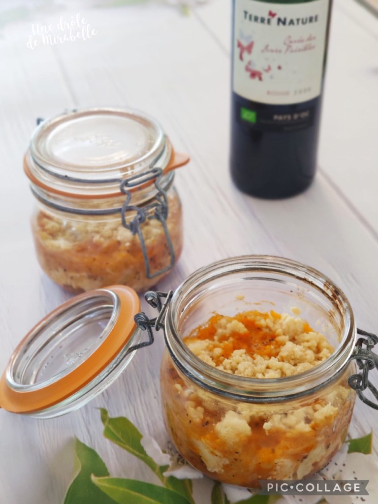 • Dans des pots allant au four (j’ai utilisé des bocaux Le Parfait), verser un fond de sauce tomates puis le fromage de chèvre. Terminer avec le crumble.