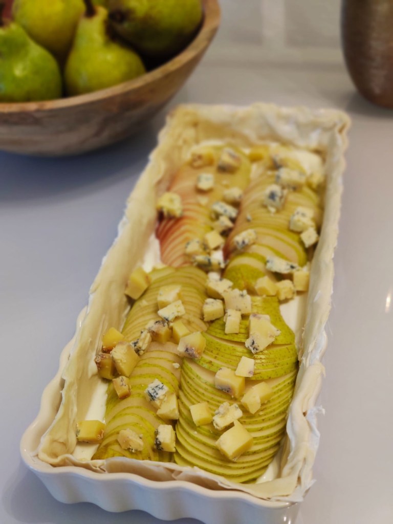 L’automne est arrivé 🍁 et les poires 🍐 envahissent les étales. C’est donc sous la forme d’une tarte sucrée-salée que j’ai décidé de les déguster, agrémentées d’un fromage découvert à la ferme de Viltain : la Fourme de Montbrison. La Fourme de Montbrison est un fromage à pâte persillée qui se rapproche de la Fourme D’Ambert, quoique plus doux et plus fruité. C’est un fromage qui se fait rare puisqu’ils ne seraient plus qu’une poignée de producteurs en France à le produire.