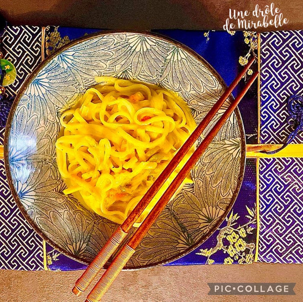 Aujourd’hui, je vous propose de déguster de délicieuses tagliatelles de riz thaï au curry, lait de coco, légumes et poulet !