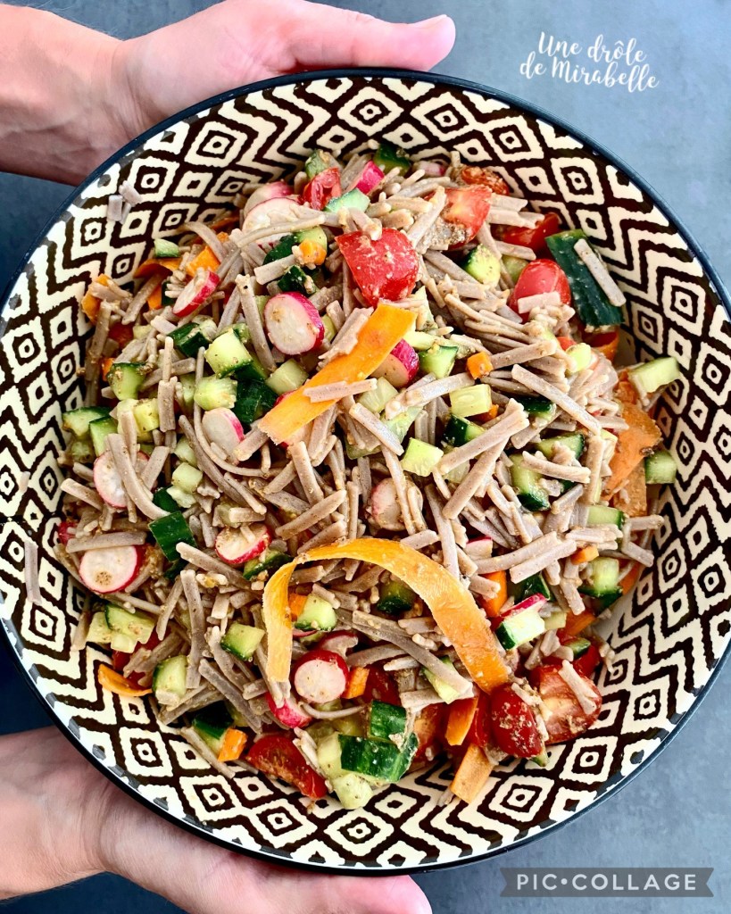 Une salade multicolore à la fois rafraîchissante, gourmande et équilibrée, ça vous dit ? Ce soir, je vous présente donc cette salade de nouilles soba (des nouilles japonaises au sarrasin) avec ses légumes multicolores et sa sauce cacahuètes 🥜 !Une recette directement inspirée de celle de Fitspau et que j’ai adapté aux légumes que j’avais sous la main.