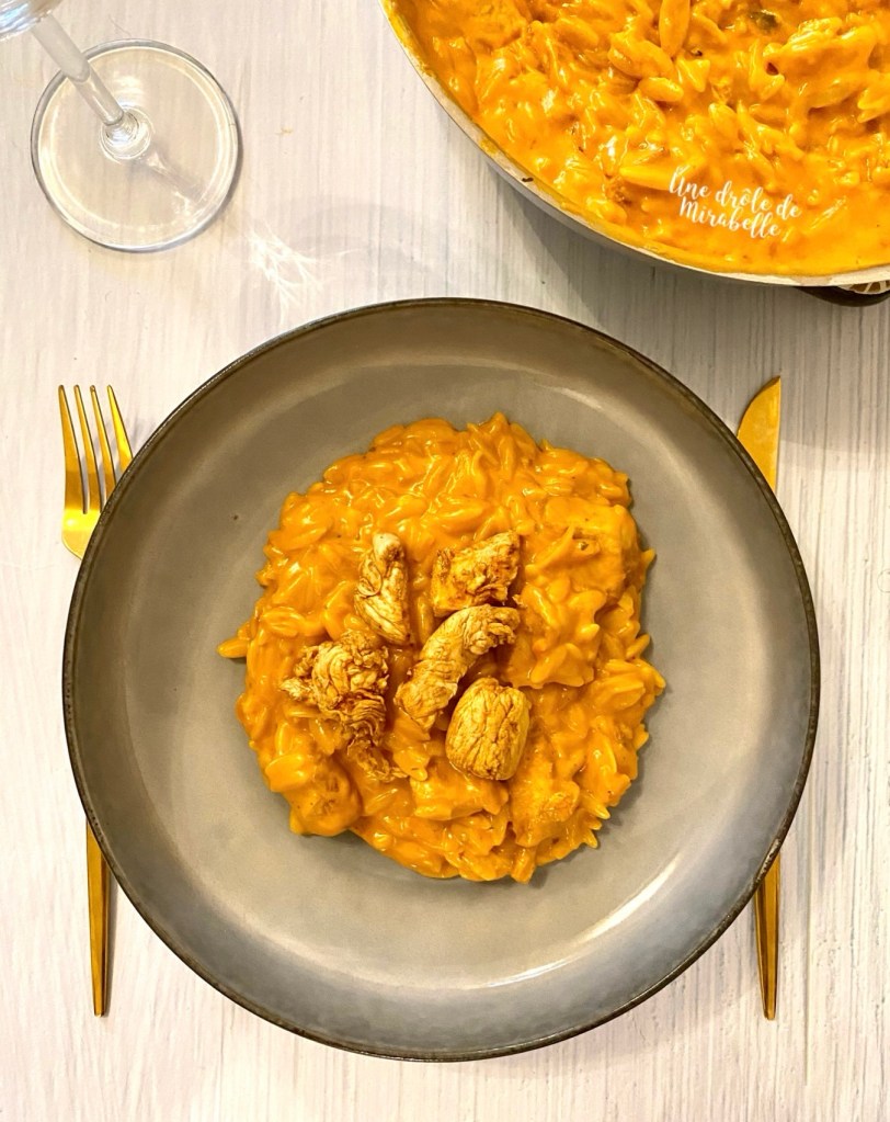 Ce soir, je vous propose de déguster un délicieux orzo crémeux et son poulet au paprika fumé. Une recette aux airs de risotto et validée par les Mirabelle !